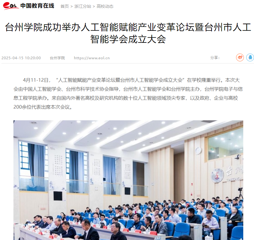 台州学院成功举办人工智能赋能产业变革论坛暨台州市人工智能学会成立大会
