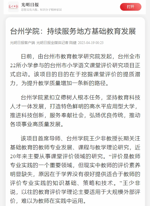 该项目首席导师、台州学院王少非教授长期关注基础教育的教师专业发展、课程与教学理论研究,近20年来主要从事课堂评价领域的研究。“评价是教师专业实践的一个重要领域,但现实中教师的评价素养明显缺失,原因在于学界没有很好提供适合于教师的评价专业实践的知识基础、策略和技术。”王少非说,以往的教育评价学理论主要适用于大规模外部评价,难以为教师在实践中运用。