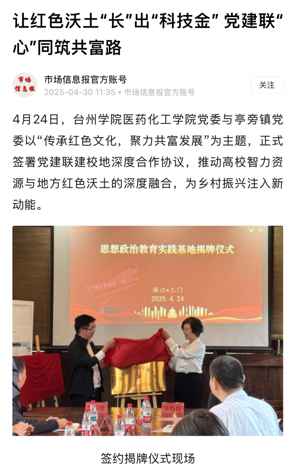 4月24日,台州学院医药化工学院党委与亭旁镇党委以“传承红色文化,聚力共富发展”为主题,正式签署党建联建校地深度合作协议,推动高校智力资源与地方红色沃土的深度融合,为乡村振兴注入新动能。