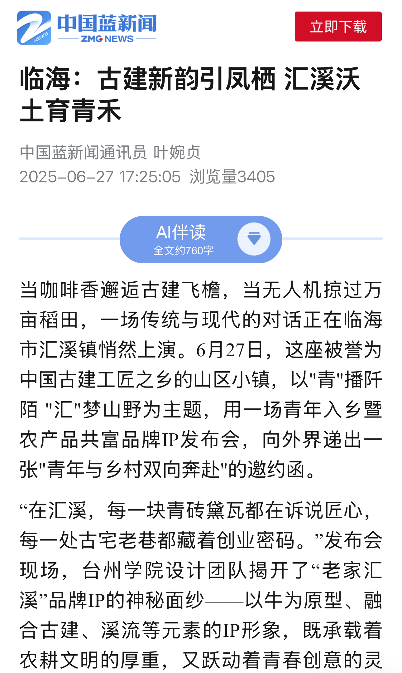 当咖啡香邂逅古建飞檐,当无人机掠过万亩稻田,一场传统与现代的对话正在临海市汇溪镇悄然上演。6月27日,这座被誉为中国古建工匠之乡的山区小镇,以"青"播阡陌 "汇"梦山野为主题,用一场青年入乡暨农产品共富品牌IP发布会,向外界递出一张"青年与乡村双向奔赴"的邀约函。