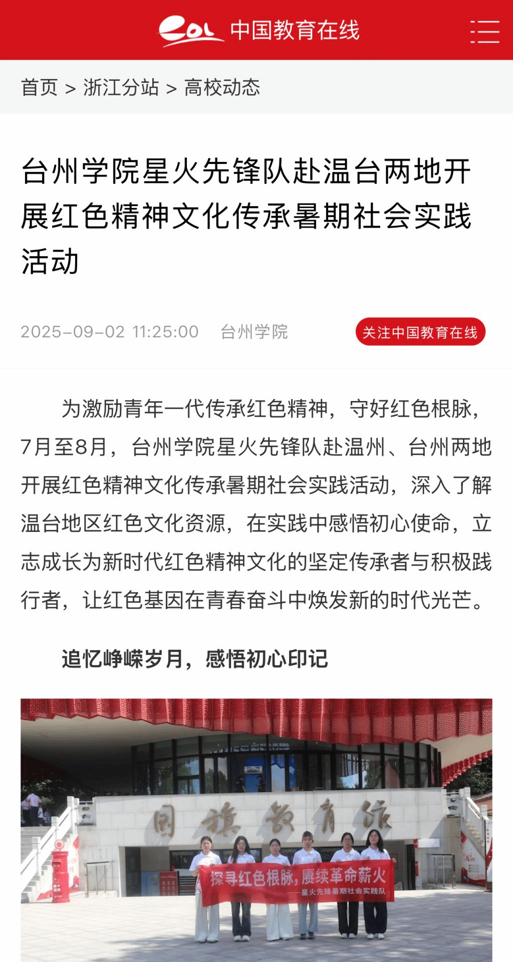 为激励青年一代传承红色精神,守好红色根脉,7月至8月,台州学院星火先锋队赴温州、台州两地开展红色精神文化传承暑期社会实践活动,深入了解温台地区红色文化资源,在实践中感悟初心使命,立志成长为新时代红色精神文化的坚定传承者与积极践行者,让红色基因在青春奋斗中焕发新的时代光芒。