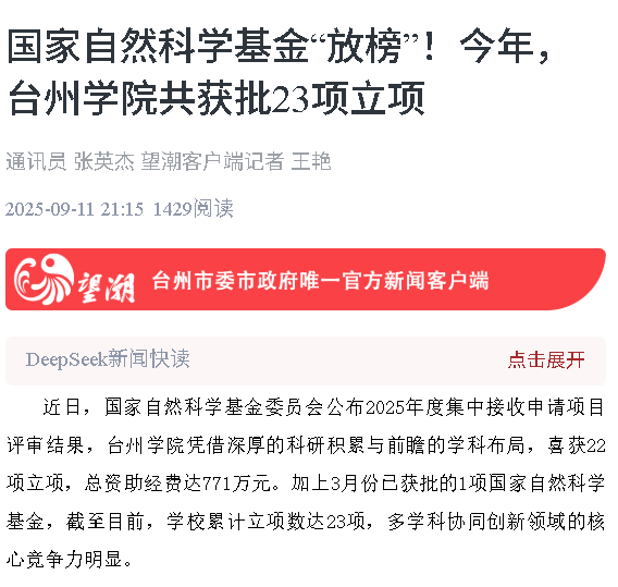 国家自然科学基金作为我国基础研究领域最具权威性、影响力的科研资助项目,其立项成果是衡量高校科研实力、学科水平与人才梯队建设的核心指标。接下来,台州学院将继续以服务国家重大战略和区域发展为导向,深化教育科技人才一体化改革,力争承接更多重大科研项目、产出更多标志性成果,为实现高水平科技自立自强贡献力量。