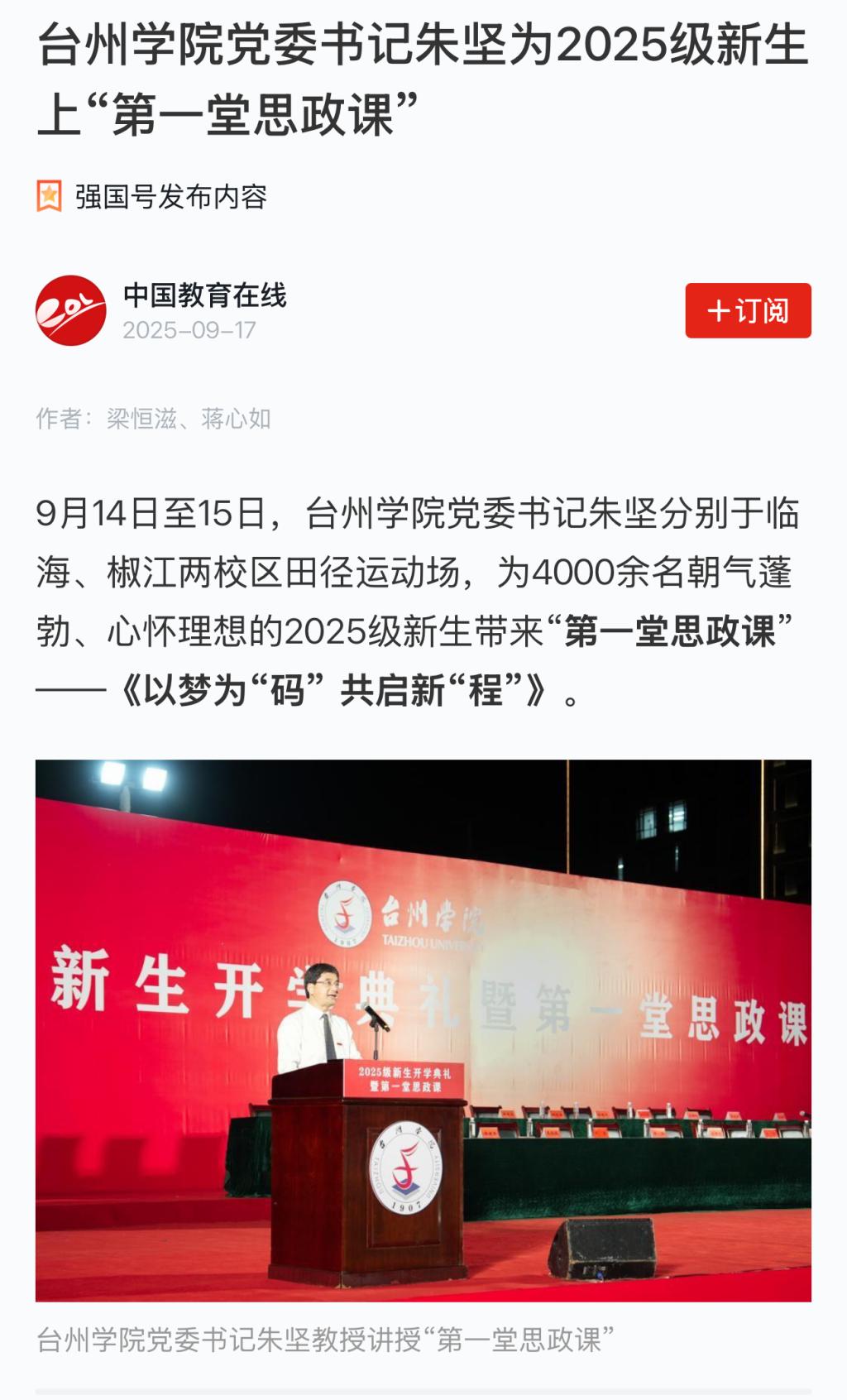 台州学院党委书记朱坚为2025级新生上“第一堂思政课”