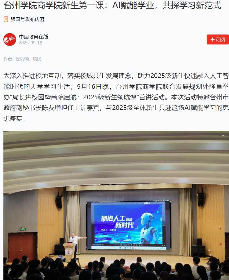 为深入推进校地互动,落实校城共生发展理念,助力2025级新生快速融入人工智能时代的大学学习生活,9月16日晚,台州学院商学院联合发展规划处隆重举办“局长进校园暨商院启航:2025级新生领航课”首讲活动。本次活动特邀台州市政府副秘书长陈友增担任主讲嘉宾,与2025级全体新生共赴这场AI赋能学习的思想盛宴。