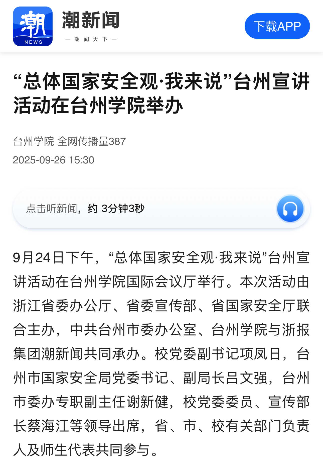 9月24日下午,“总体国家安全观·我来说”台州宣讲活动在台州学院国际会议厅举行。本次活动由浙江省委办公厅、省委宣传部、省国家安全厅联合主办,中共台州市委办公室、台州学院与浙报集团潮新闻共同承办。校党委副书记项凤日,台州市国家安全局党委书记、副局长吕文强,台州市委办专职副主任谢新健,校党委委员、宣传部长蔡海江等领导出席,省、市、校有关部门负责人及师生代表共同参与。