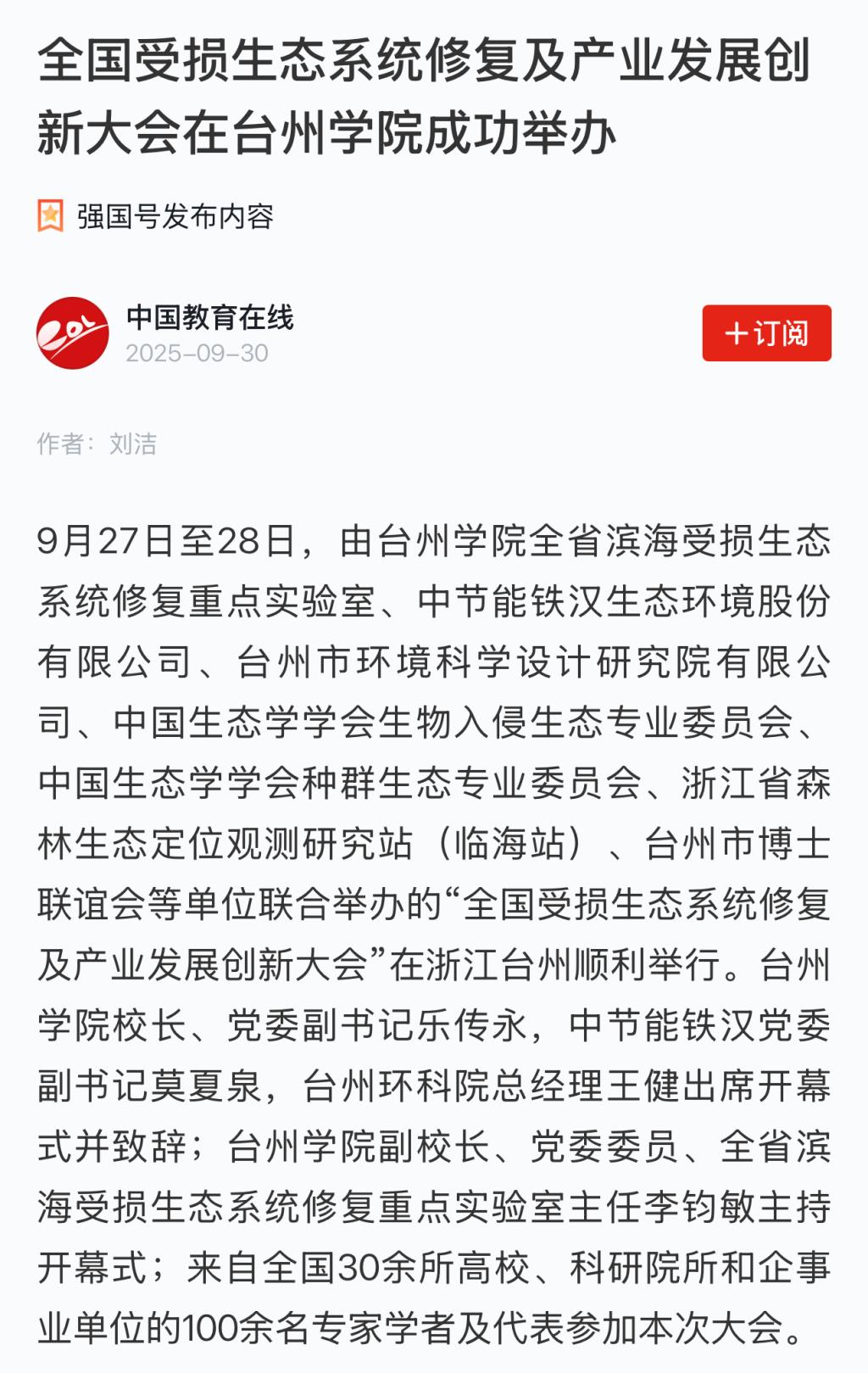 全国受损生态系统修复及产业发展创新大会在台州学院成功举办