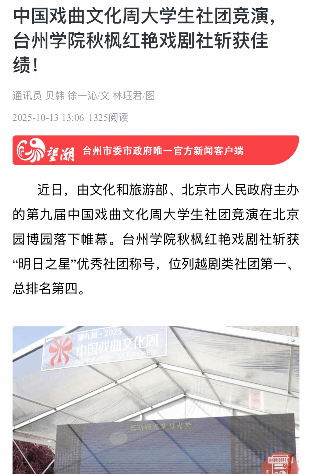 作为一项国家级戏曲盛事,中国戏曲文化周大学生社团竞演汇聚了全国高校戏曲社团的精品力作。秋枫红艳戏剧社能在激烈竞争中跻身前列,不仅体现了社团扎实的艺术功底和持续的创新追求,也反映了台州学院在推动文化育人、传承中华优秀传统文化方面的扎实成效。
