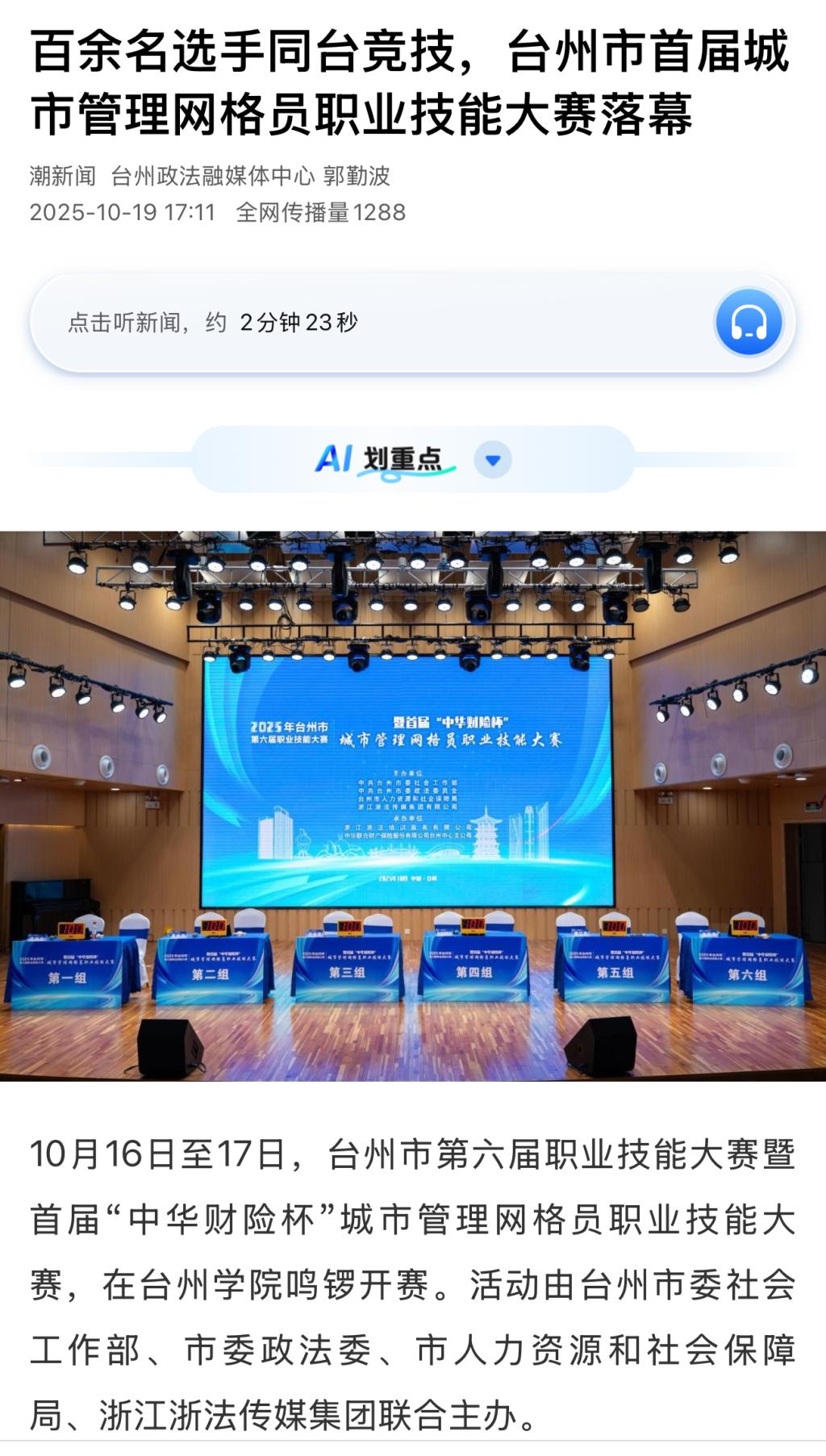 10月16日至17日,台州市第六届职业技能大赛暨首届“中华财险杯”城市管理网格员职业技能大赛,在台州学院鸣锣开赛。活动由台州市委社会工作部、市委政法委、市人力资源和社会保障局、浙江浙法传媒集团联合主办。