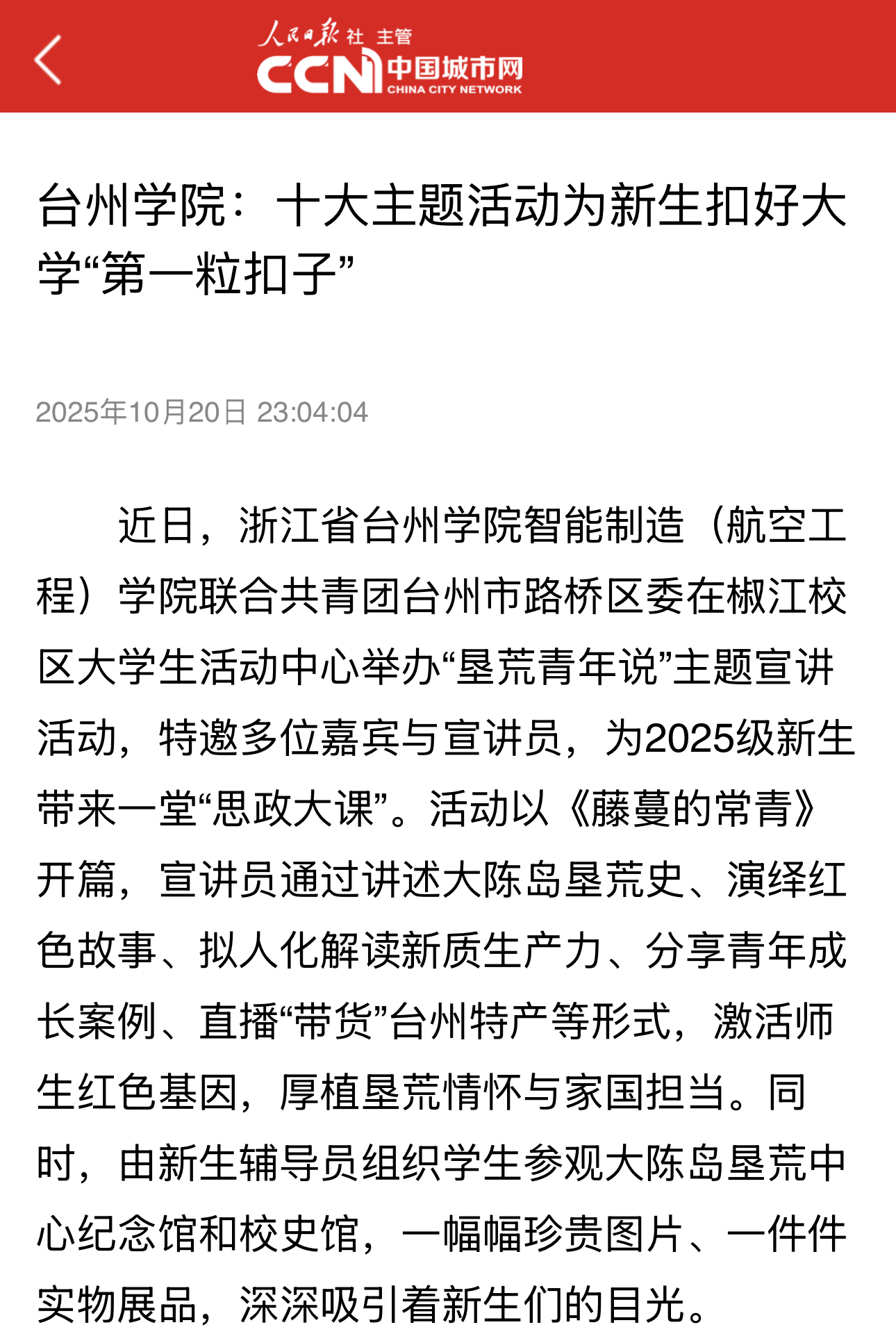 近日,浙江省台州学院智能制造(航空工程)学院联合共青团台州市路桥区委在椒江校区大学生活动中心举办“垦荒青年说”主题宣讲活动,特邀多位嘉宾与宣讲员,为2025级新生带来一堂“思政大课”。活动以《藤蔓的常青》开篇,宣讲员通过讲述大陈岛垦荒史、演绎红色故事、拟人化解读新质生产力、分享青年成长案例、直播“带货”台州特产等形式,激活师生红色基因,厚植垦荒情怀与家国担当。同时,由新生辅导员组织学生参观大陈岛垦荒中心纪念馆和校史馆,一幅幅珍贵图片、一件件实物展品,深深吸引着新生们的目光。