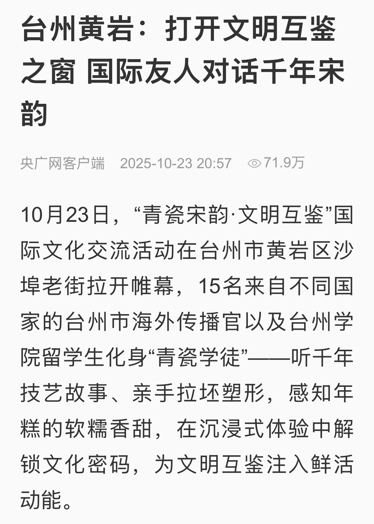 10月23日,“青瓷宋韵·文明互鉴”国际文化交流活动在台州市黄岩区沙埠老街拉开帷幕,15名来自不同国家的台州市海外传播官以及台州学院留学生化身“青瓷学徒”——听千年技艺故事、亲手拉坯塑形,感知年糕的软糯香甜,在沉浸式体验中解锁文化密码,为文明互鉴注入鲜活动能。