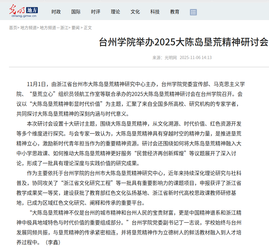 11月1日,由浙江省台州市大陈岛垦荒精神研究中心主办,台州学院党委宣传部、马克思主义学院、“垦荒立心”组织员领航工作室等联合承办的2025大陈岛垦荒精神研讨会在台州学院召开。会议以“大陈岛垦荒精神彰显时代价值”为主题,汇聚了来自全国多所高校、研究机构的专家学者,共同探讨大陈岛垦荒精神的深刻内涵与时代意义。