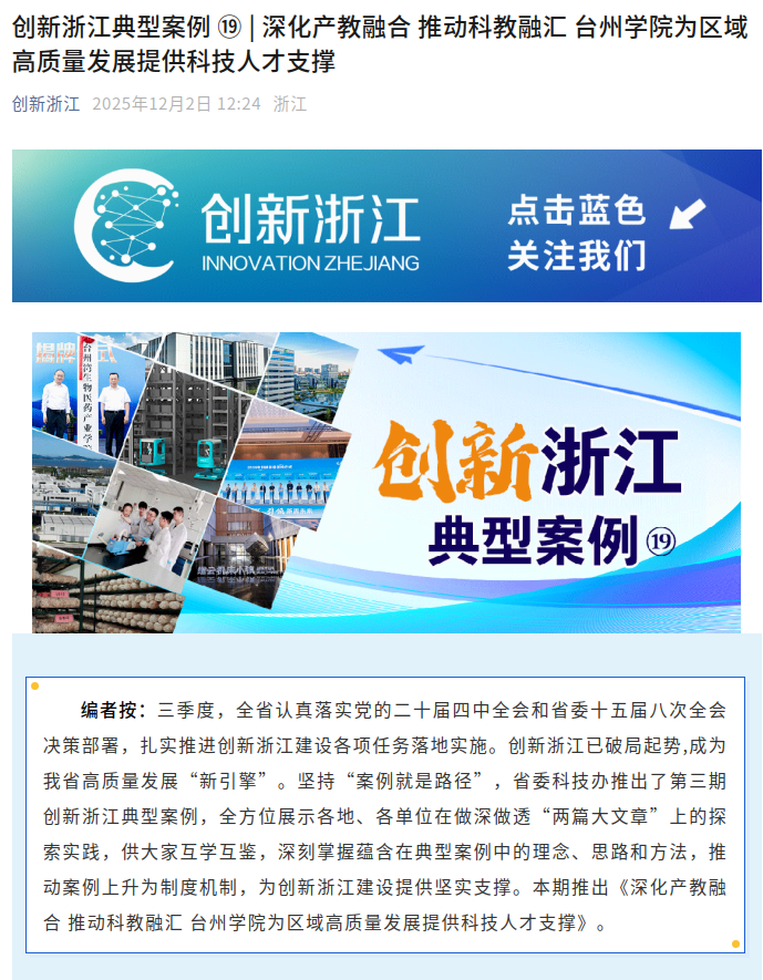 编者按:三季度,全省认真落实党的二十届四中全会和省委十五届八次全会决策部署,扎实推进创新浙江建设各项任务落地实施。创新浙江已破局起势,成为我省高质量发展“新引擎”。坚持“案例就是路径”,省委科技办推出了第三期创新浙江典型案例,全方位展示各地、各单位在做深做透“两篇大文章”上的探索实践,供大家互学互鉴,深刻掌握蕴含在典型案例中的理念、思路和方法,推动案例上升为制度机制,为创新浙江建设提供坚实支撑。本期推出《深化产教融合 推动科教融汇 台州学院为区域高质量发展提供科技人才支撑》。