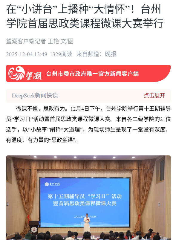 思政教育是落实立德树人根本任务的关键课程。本次微课大赛不仅为思政课教师搭建了展示风采、交流互鉴、提升能力的平台,也进一步激发了教师对思政课教学规律与创新路径的深入思考。台州学院将持续深化思政课教学改革,不断创新教学形式与方法,推动思政教育如春风化雨,浸润学生成长,努力培养担当民族复兴大任的时代新人。