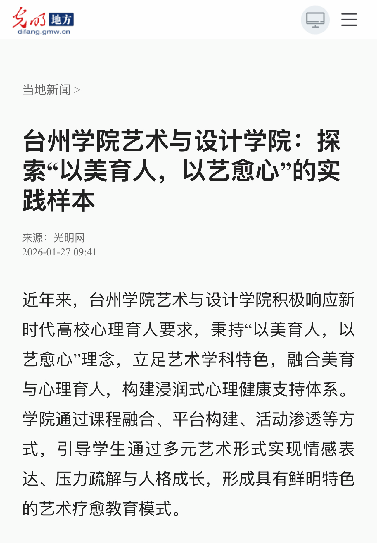 近年来,台州学院艺术与设计学院积极响应新时代高校心理育人要求,秉持“以美育人,以艺愈心”理念,立足艺术学科特色,融合美育与心理育人,构建浸润式心理健康支持体系。学院通过课程融合、平台构建、活动渗透等方式,引导学生通过多元艺术形式实现情感表达、压力疏解与人格成长,形成具有鲜明特色的艺术疗愈教育模式。