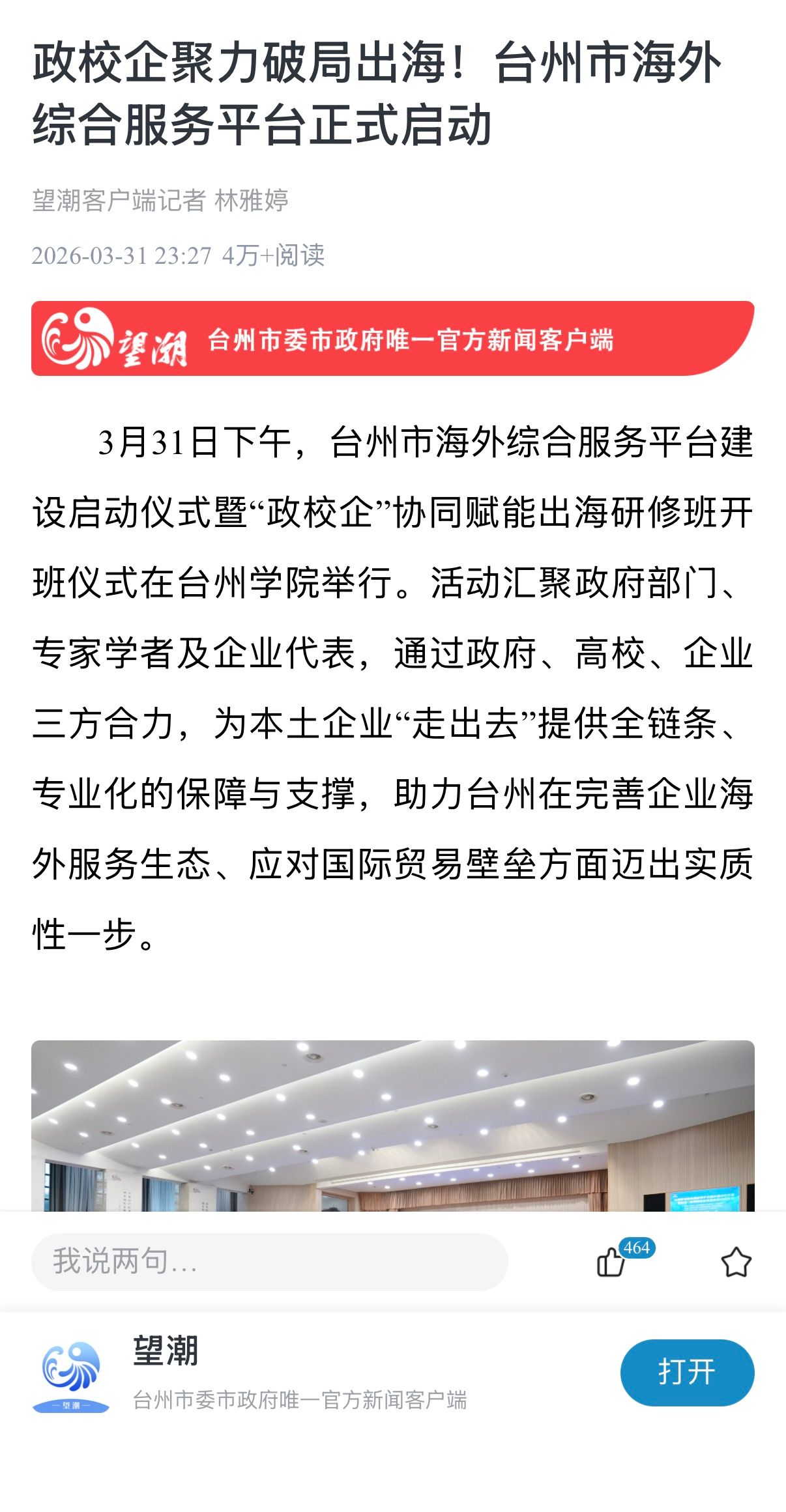 3月31日下午,台州市海外综合服务平台建设启动仪式暨“政校企”协同赋能出海研修班开班仪式在台州学院举行。活动汇聚政府部门、专家学者及企业代表,通过政府、高校、企业三方合力,为本土企业“走出去”提供全链条、专业化的保障与支撑,助力台州在完善企业海外服务生态、应对国际贸易壁垒方面迈出实质性一步。