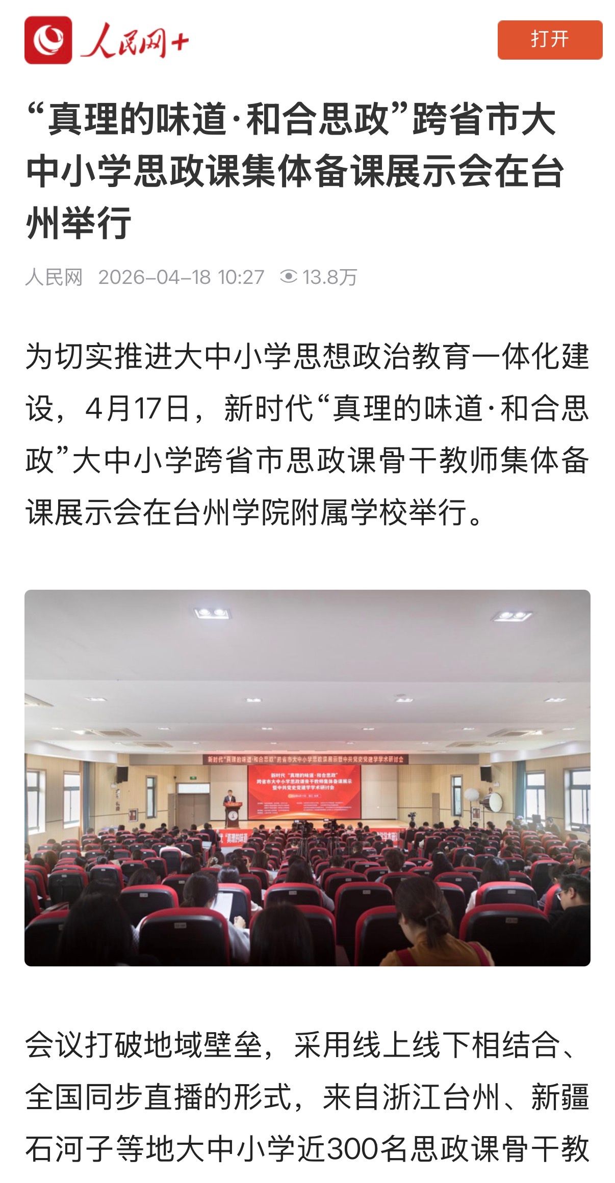 为切实推进大中小学思想政治教育一体化建设,4月17日,新时代“真理的味道·和合思政”大中小学跨省市思政课骨干教师集体备课展示会在台州学院附属学校举行。
