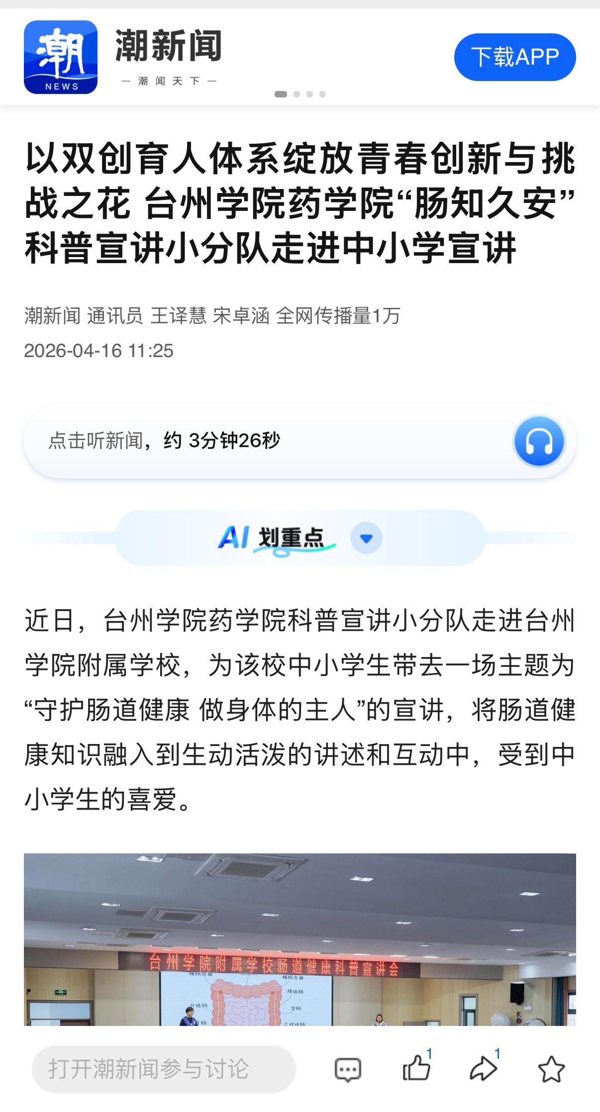 近日,台州学院药学院科普宣讲小分队走进台州学院附属学校,为该校中小学生带去一场主题为“守护肠道健康 做身体的主人”的宣讲,将肠道健康知识融入到生动活泼的讲述和互动中,受到中小学生的喜爱。