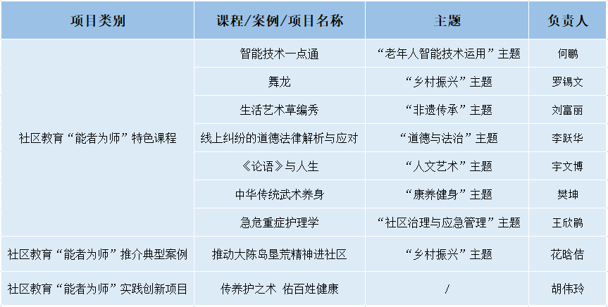 我校多个课程、案例、项目入选名单,其中《智能技术一点通》等七门课程入选社区教育“能者为师”特色课程项目;《推动大陈岛垦荒精神进社区》入选社区教育“能者为师”推介典型案例;《传养护之术 佑百姓健康》入选社区教育“能者为师”实践创新项目。