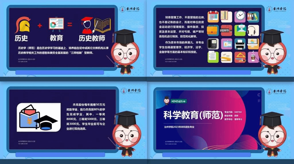 注重应“势”而“为”,以“三化”促“三力”。一是以“数字化”宣传材料,提升传播影响力。教务处(招生办公室)持续推进《台州学院2023年报考指南》《台州学院2023年招生简章》等核心宣传材料的数字化传播,充分发挥数字化传播途径便捷、快速、高效的特点,通过学校官网首页、新媒体平台等信息化渠道快速推广,获得社会广泛关注,阅读量过万。二是以“简约化”宣传内容,增强专业吸引力。通过印制《三言两语说专业》宣传册,以简练通俗的文字凝练学校55个招生专业的核心特质,在确保考生和家长对各专业情况一听就懂的同时,以大道至简的方式和更加鲜明的特色,生动呈现专业吸引力。三是以“AI化”宣传形式,打造台院IP辨识力。在“虚拟数字人+短视频”组合崛起的流量时代,教务处(招生办公室)与时间赛跑,将台州学院招生卡通形象大使“昭昭”从二维平面转变为live2d虚拟主播,制作了55集“昭昭说专业”短视频,从每个专业是什么、在校学什么、毕业干什么、特色有什么等四个方面,分分钟讲透专业内涵,确保考生和家长看得进、听得懂、记得住,该合集浏览量达数万次。