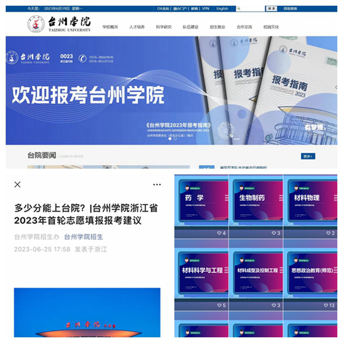 注重顺“时”而“动”,以“三借”提“三度”。一是借势顶流媒体直播平台,提升“能见度”。在招生季期间,教务处(招生办公室)相关负责人先后在腾讯教育、中国教育在线和新浪微博等考生广泛关注的高招媒体,做好招生直播宣讲,《腾讯新闻 招办发言人|台州学院:浙江大地上的一匹黑马》《中国教育在线 浙江高考帮|台州学院:计划招收全日制本科生4700余人,新增2个专业!师范类专业有传统优势,学科竞赛氛围浓厚!》等内容一经发布后,在考生和社会群体中收到较好反响,其中,腾讯直播累计浏览量达84万余次。二是借助各大主流媒体,增强“知名度”。学校相关招生宣传得到了浙江日报集团“潮新闻”“浙江教育报”“台州发布”“台州教育”和台州市委市政府新闻客户端“望潮”等官方媒体的转载报道,与此同时,在浙江省高考出分当天,教务处(招生办公室)通过腾讯微信定向投放朋友圈招生广告,确保考生和家长打开微信朋友圈就能接收到招生信息,最大限度提升宣传效果。三是借力校内本科招生宣传平台建设,刷新“显示度”。教务处(招生办公室)积极拓展微信公众号、微信视频号、今日头条号,多渠道加强招生信息的投放, “台州学院招生”微信公众号在6月份的累计阅读量近12万次,其中,《多少分能上台院?|台州学院浙江省2023年首轮志愿填报报考建议》一文的单日阅读量逾2万。