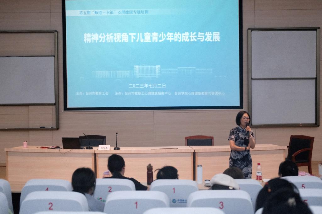 为进一步提升全市教职工心理健康工作能力,7月2-3日,由台州市教育工会主办,台州市教职工心理健康服务中心、台州学院心理健康教育与咨询中心联合承办的第五期“师道·幸福”心理健康专题培训活动在椒江校区学术报告厅举行。活动特邀东南大学应用心理研究所所长马向真教授作“精神分析视角下儿童青少年的成长和发展”为主题的心理健康专题培训,学工部部长王秋方主持培训,全市200余名教职工参加学习。