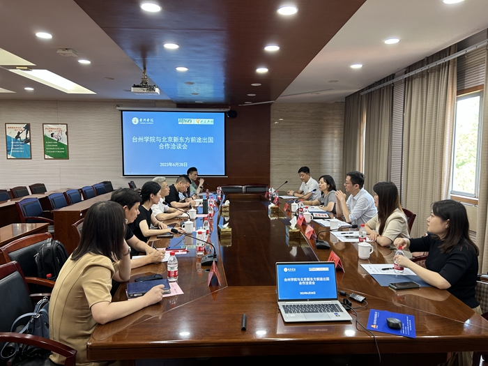 宋丹代表新东方团队感谢我校盛情接待,表示新东方与台州学院前期合作密切,新东方与全球名校建立了很多合作与友好关系,致力于开发海外资源与合作项目,后续将加强与台州学院合作,根据台州学院办学情况匹配项目,帮助引进优质资源,助力台州学院大发展。