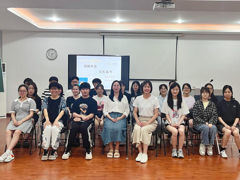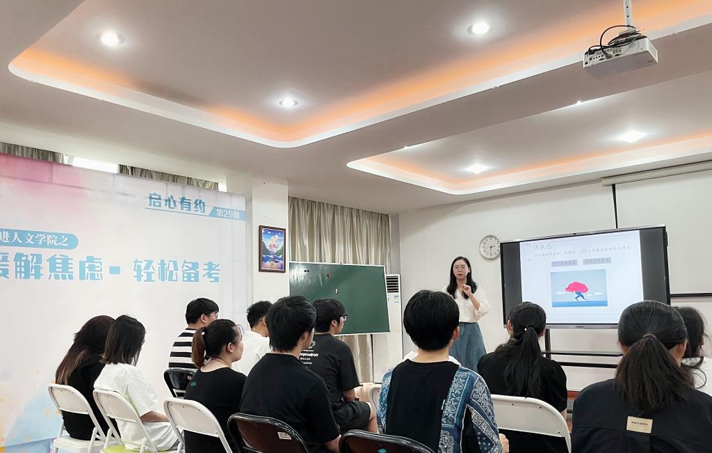 为进一步提升同学们的心理健康水平,缓解考试焦虑,6月8日下午,学工部心理健康教育与咨询中心联合人文学院、润心工作室开展“缓解焦虑•轻松备考”为主题的第29期“启心有约”活动。心理中心专职心理咨询师陈矜之主持,人文学院辅导员刘丽娟及近40位学生参与活动。