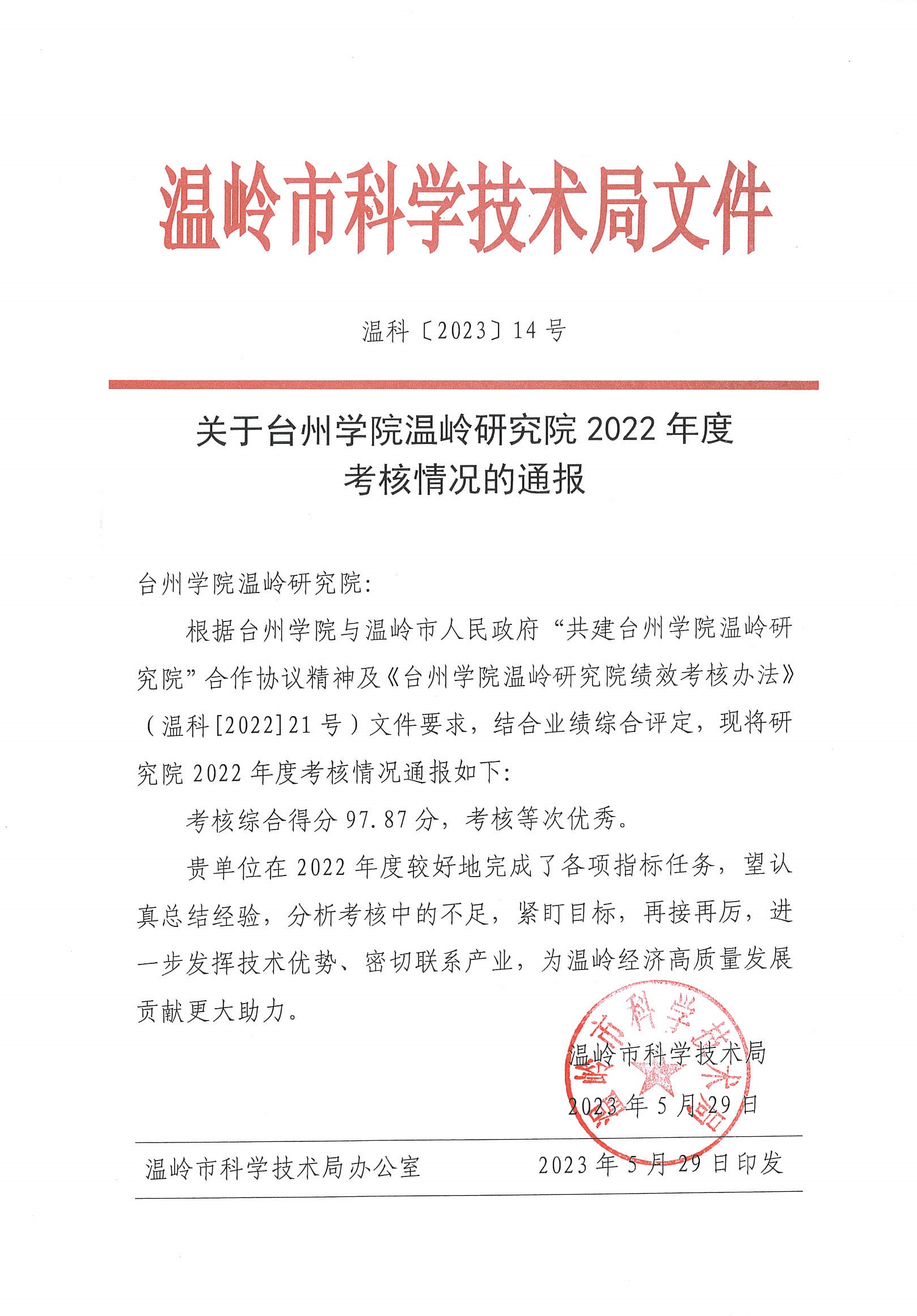 近日,温岭市公布2022年度科创平台绩效考核结果,台州学院温岭研究院在全国17家高校驻温岭市科创平台年度考核中获优秀等次(全市3家优秀)。