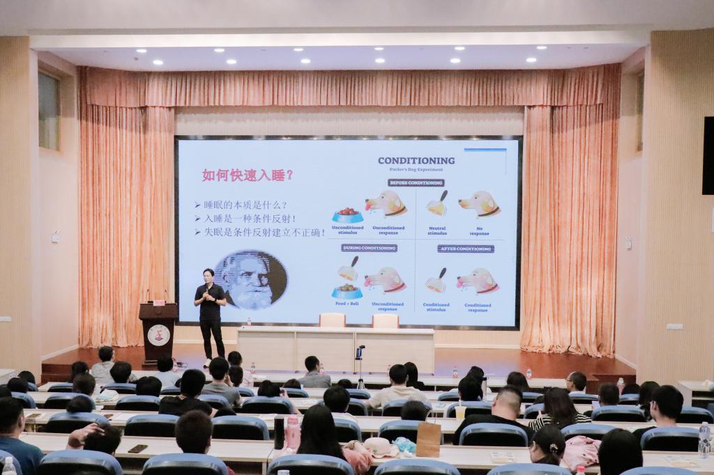 本次活动由心湖书吧、校团委、图书馆共同主办。讲座伊始,金铂以人体状态分布图为切入点,引出了“亚健康”的概念。他结合扁鹊“上医治未病,下医治已病”指出,从亚健康状态中恢复更多要靠自我调控,希望每个人都能成为自己的“上医”。针对亚健康的形成原因,他指出,人体绝大多数的健康问题都与压力过大有关,长期持续存在的小压力不断积累也会威胁健康,所以,学会处理好压力与健康的关系是改善亚健康的关键。