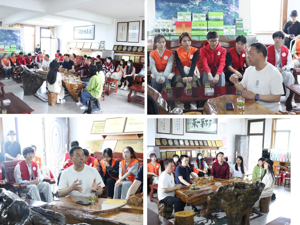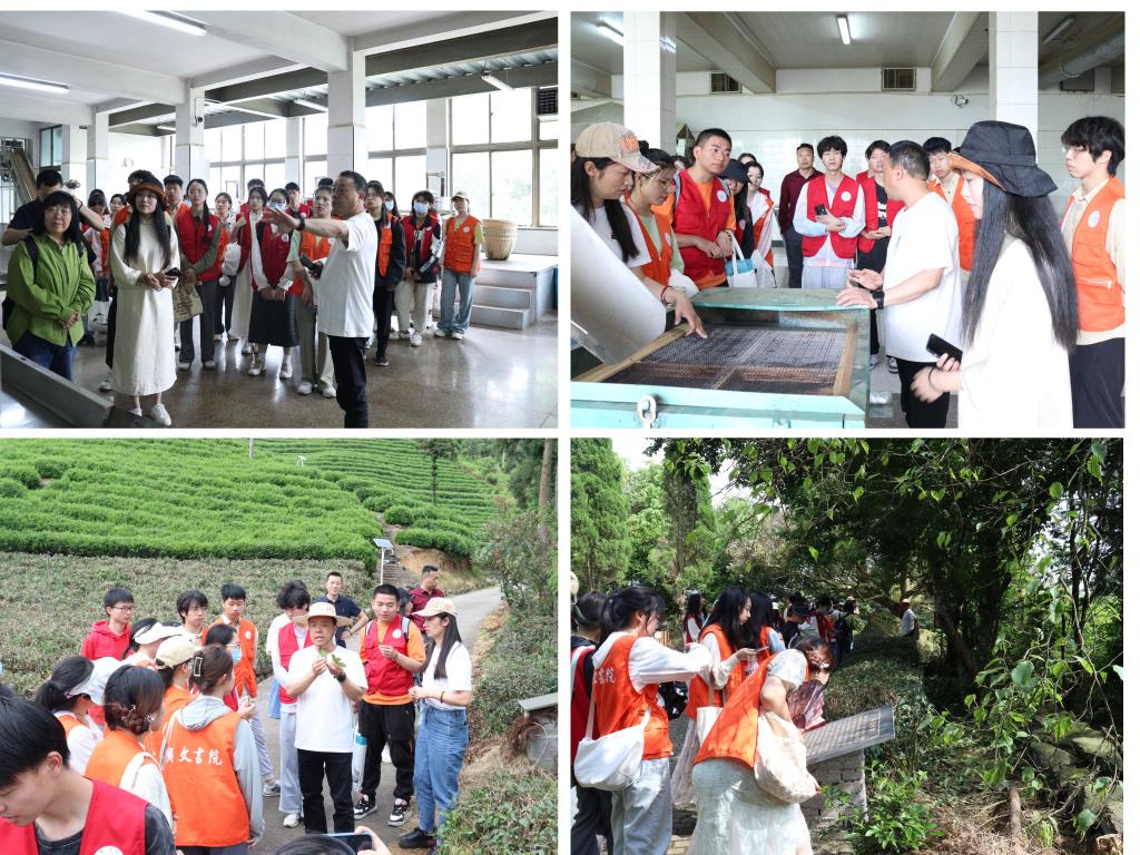 随后,朱朝安带领书院学子参观茶厂生产车间,详细地讲述羊岩勾青的制作过程。茶叶采摘后,需依次经过摊放、杀青、揉捻、炒小锅、炒对锅等工序;成茶后外形呈腰圆,色泽隐绿,汤取色黄绿明亮,香味醇厚,也因此戏称其为“羊岩勾魂”。在此过程中,朱朝安还介绍了茶厂特色专利如色透机、匀摊机等。紧接着,他又带领广文师生前往茶山进行实地鉴赏,茶山每50米为一品种,书院学子边听讲解,边采摘,了解到不少茶叶品种的差异、制茶的技术以及悠久的茶文化。