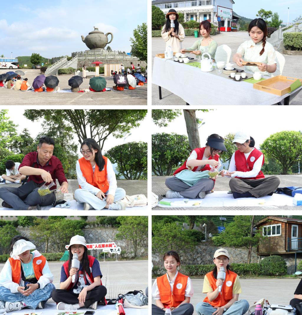 在参观、鉴赏、采摘后,大家又来到了“茶壶”景点,进行“无我”茶会。徐凤君提到,“无我”茶会是一种参加者自带茶叶、茶具,人人泡茶、人人敬茶、人人品茶,一味同心的茶会形式。在她的主持和引导下,书院学子分成两组进行红茶和绿茶冲泡的茶艺展示。学子们纷纷展示所学的茶艺知识,净手、汤器、请茶、洗茶、泡茶、拂盖、封壶、分杯、回壶、分茶、奉茶、闻香、品茗,无论是茶道文化,还是茶艺文化,学子们将理论转化成实践,不断提升自身素养与才能。