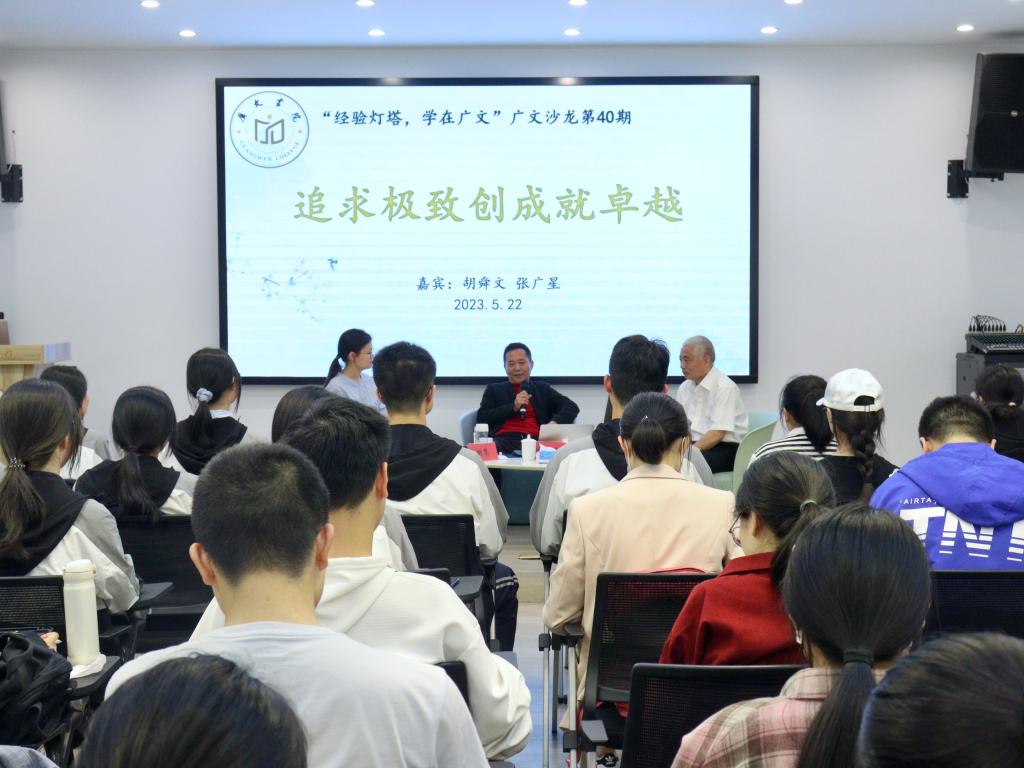 5月22日晚,广文书院在多功能厅举办第40期广文沙龙。沙龙以“追求极致创成就卓越”为主题,邀请了台州广电总台总编辑胡舜文、编委张广星,讲述精彩人生,分享成就故事。现场坐满了广文学生和大田中学的学生,聆听前辈的奋斗经历。