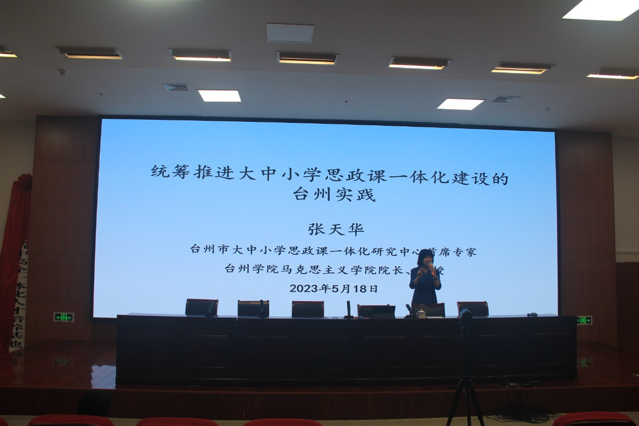 会上,张天华教授从国家、省市和县域层面就《统筹推进大中小学思政课一体化建设的台州实践》作主题报告,浙江省优秀思政课教师、禁毒教育宣讲团讲师杨宇琦为参会师生作禁毒教育宣讲。