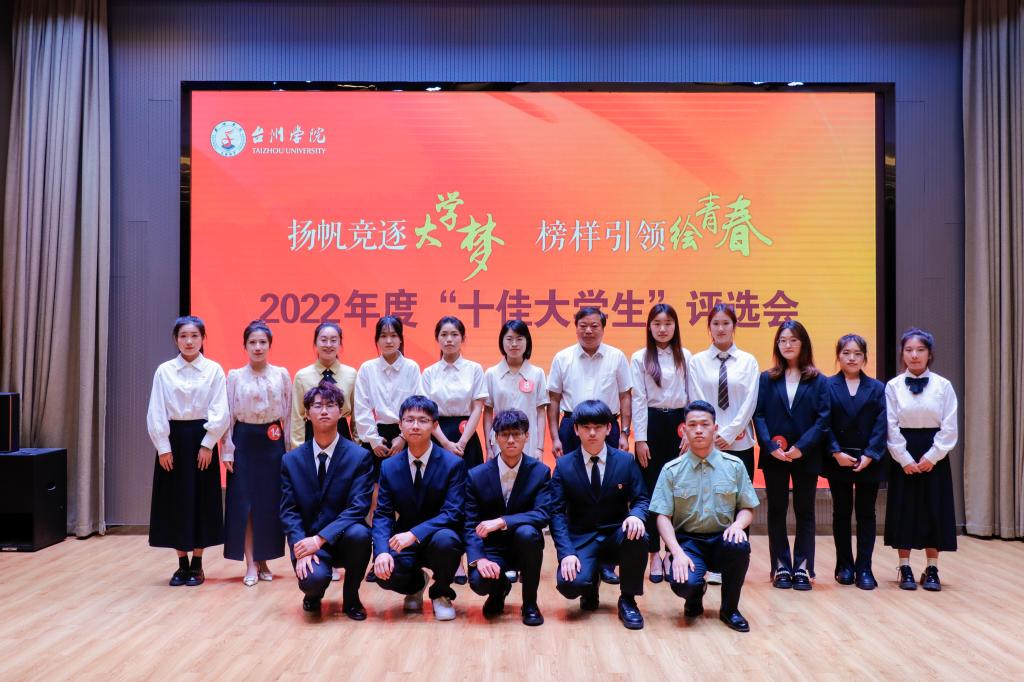 活动伊始,金先龙为2021年度“十佳大学生”颁发荣誉证书并合影留念。在评选会上,候选人们各显神通,展开激烈角逐,从学业生活、科研竞赛、志愿服务、社会实践等多个方面,结合制作精美的PPT,展示了自己精彩纷呈的大学生活。智能制造学院的张民杰秉持“张帆学海得金冠,民生为本人中杰”的座右铭,讲述“求学”与“做人”的青春故事;教师教育学院的曹思佳怀揣着教书育人的梦想,在圆梦之路上砥砺前行;建筑工程学院的余茜赛知心怀“深植家国情怀,拓展国际视野”的远大志向,勇做土木道路上的创新先锋;外国语学院的郑檬鹂从“Endeavor”“Energy” “Earnest”“Enthusiasm”四个方面,分享E路向潜的丰富经历;药学院的贺贤杰坚信“少年不惧岁月长,彼方尚有荣光在”,直面困难,不惧逆境,通过努力拼搏实现精彩蝶变;人文学院的夏雨诗保持青春的活力,挥洒奋斗的汗水,执着生命的追求,谱写多彩的人生诗篇;马克思主义学院的陈茗园围绕“看见光,追随光,成为光”,述说“追寻马列之光,迭代思政之梦”的奋斗历程……候选同学以自立自强、奋发向上的姿态诠释了新时代台院青年的精神风貌,他们丰富的大学经历与精彩的现场表现博得全场师生的阵阵掌声。
