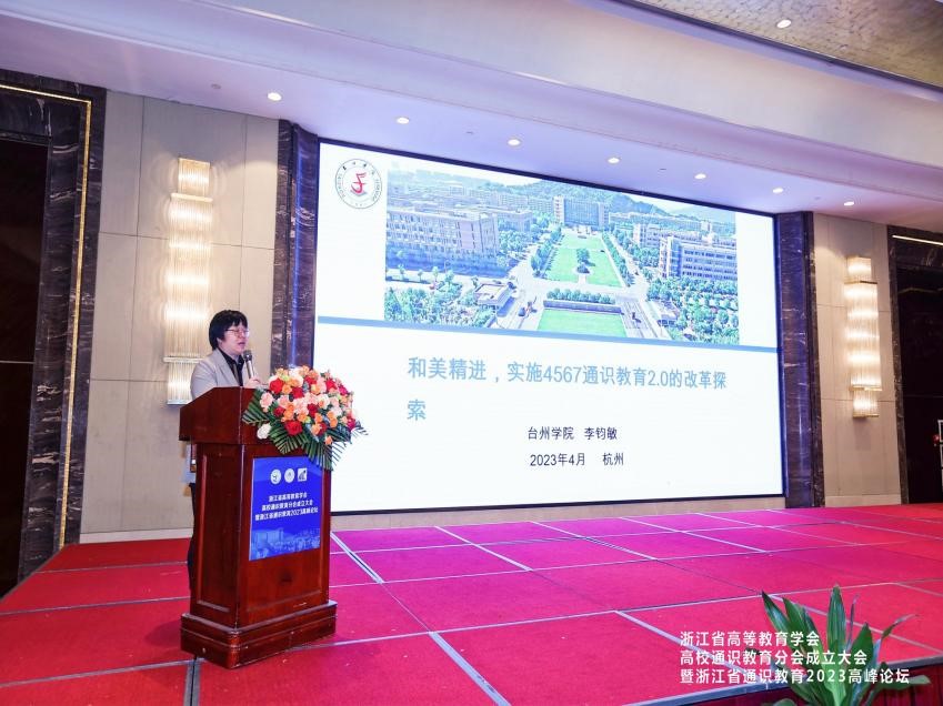 李钧敏代表学校通识教育中心作了题为《和美精进,实施4567通识教育2.0的改革探索》的发言。她从台州学院通识教育改革背景讲起,介绍了我校通识教育的开展情况,阐述了学校以“和美精进”培养理念,从通识教育体系重构、课程建设、空间拓展、管理优化、质量提升等维度构建“五位一体”改革实施路径,重点解读了“4567”通识教育2.0的改革内涵及改革成效,即“4”个通识课程体系、“5”个综合素养模块、“6”个通识教育空间、“7”个通识教育分中心,并介绍了以学生自我管理、自我发展为主体的一站式数字化通识教育服务平台。