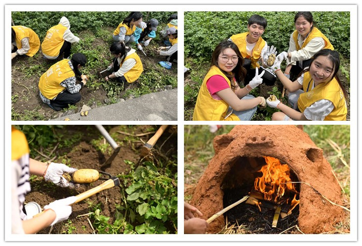 第一站——齐心搭土窑挖土豆,体验劳动之美。活动伊始,同学们按照向导讲解的“土窑搭建攻略”,分成4个小组,纷纷运用专业特长,各司其职,有的提水、有的搬运泥土、有的精心设计土窑造型,用泥土、石头、稻草这些简单天然的材料搭建土窑。随着土窑的初具成型,同学们来到土豆田,拿起小锄头,开启“寻豆”之旅。经过一个小时的田间劳作,同学们与土豆结下了不解之缘。挖出的土豆大的饱满,小的可爱,大家迫不及待地把这些大大小小的“金色蛋子”清洗干净,放进搭建好的土窑里,等待“原味土豆”的出炉。