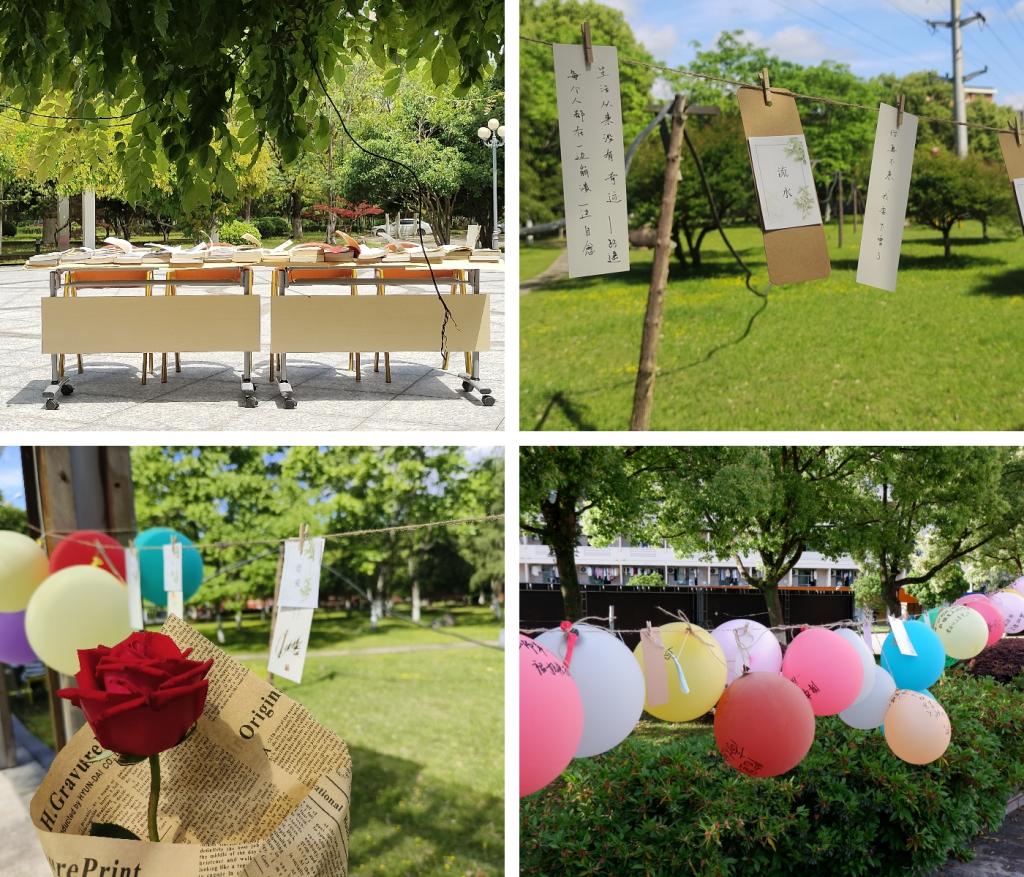 阅读活动以打卡通关的形式进行,参与者们领取书海卡,集齐四个印章,就可以领取教师捐赠的书籍盲盒。活动共设四个朗读打卡点:在校标古诗文朗读亭处,一首首或含蓄或豪放的古诗文,凝聚着中国千年的风雅和浪漫;在静溪长廊现代诗朗诵亭处,各大流派、各种风格的诗歌都展现着它们的赤忱;在散文朗诵亭处,大家在充满情调的紫藤花下与散文邂逅,在不经意间留下难忘的回忆;在大圆盘小说朗读亭,我们在动人的故事中穿梭,和书中各色的人物相遇。另外,还有“书写经典”“取词写诗”“以文会友”及“小说我来猜”活动,同学们或泼墨挥毫,或沉思吟咏,一个个香囊,一朵朵玫瑰,是对书海徜徉的人们最好的馈赠和奖赏……不论是老师同学,还是志愿工作者,都沐浴在明媚的春光下,沉浸在朗朗的书声中,畅读畅听畅想,与名著对话,与经典交流。