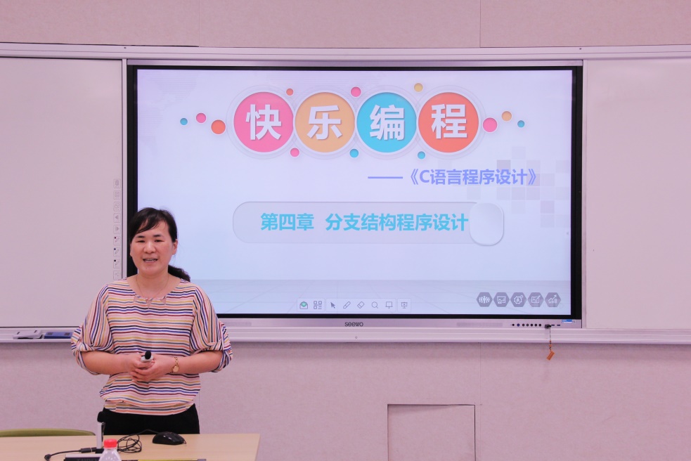 陈月芬老师以自己参加青年教师教学竞赛的课程《C语言程序设计》为例分享了青教赛的比赛经验,她以情境导入、教学目标、预习反馈、探索新知、实战训练、课堂小结、课后拓展为教学主线详细介绍了如何在课程中有机融入思政元素、如何与学生互动、如何逐级提高课程学习挑战度。与会教师对陈老师的讲解报以热烈掌声,大家对陈老师在课堂中引导学生边学边练、在第二课堂中用游戏、竞赛等手段使学生的学练赛混合留下深刻印象,充分体现了以学生为中心、以成果为导向的教学理念。