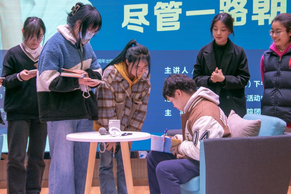 最后,李尚龙与同学和市民朋友们合影留念,亲笔签名送上祝福,他以轻松风趣、严谨恳切的语言,将同学们带入一个又一个真实的事例场景中,激发了大家的积极思考。活动现场气氛热烈,大家纷纷表示,在之后的人生旅途中,会敢于追求梦想,积极拥抱生活,不断迎接挑战,让青春活得灿烂,勇敢一路朝前。