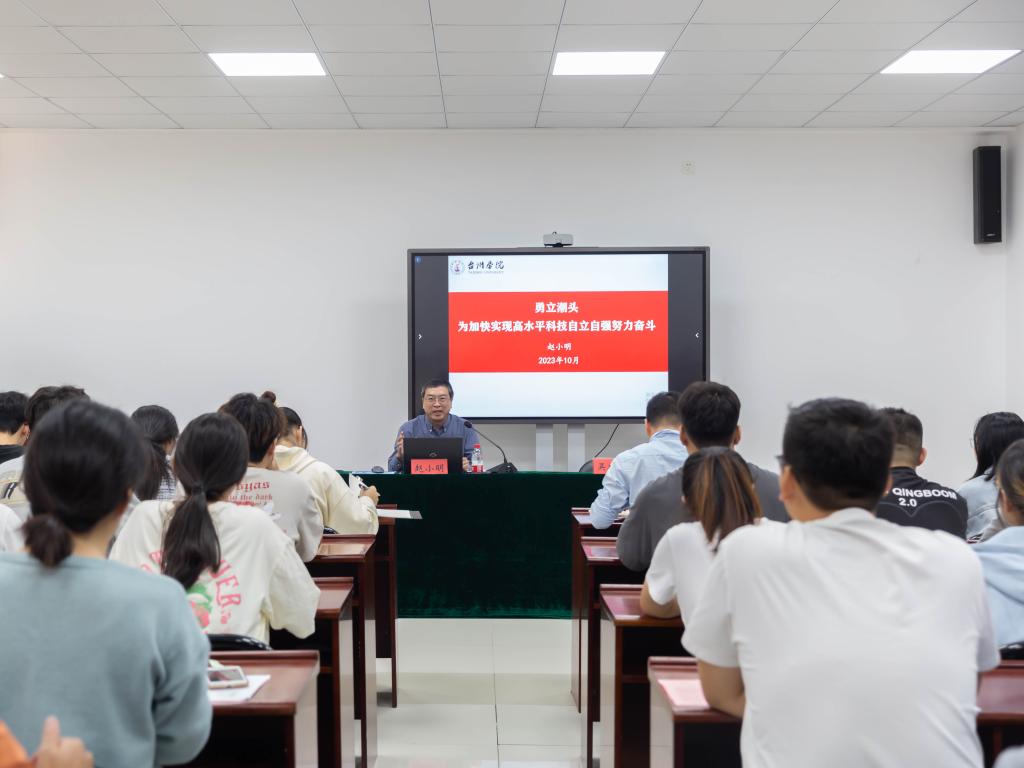 赵小明从“习近平总书记关于科技自立自强的重要论述”“全面了解高水平科技自立自强的内涵”“习近平总书记对浙江的期望与要求”“浙江在行动”“台州学院有作为”等五个方面深入阐述了高水平科技自立自强的内涵和意义,强调要进一步强化教育、科技、人才一体化发展理念,充分发挥高校在人才培养、基础研究、技术研发等前端领域不可替代的比较优势。要以科技创新推动学科建设,优化学科发展规划,形成以一流学科为引领的学科体系;以科技创新引领社会服务,坚持台州学院姓“台州”,全力打造校城“三个共同体”理念,以“能级平台群”助力创新驱动,强化有组织科研,建好科研团队,持续推进“1139科技小分队”;以科技创新推动特色强校,聚焦“315”科技创新体系15个重点领域,整合优势资源,构筑大平台、凝聚大团队、推动大交叉,承担大项目、撬动大合作。