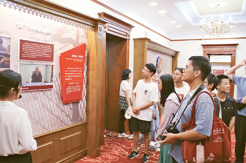 绥芬河国家安全教育展馆面积约1100平方米,由序厅、总体国家安全观、无名丰碑、周恩来展区等8个部分组成,展示了总体国家安全观、党的隐蔽战线光辉历史、当前斗争形势等内容。李大钊、周恩来等老一辈革命家在绥芬河出入境苏联时曾秘密下榻于此。作为早期红色秘密国际通道、秘密交通线掩护站点,展馆建筑如今成为珍贵的红色革命历史遗址。图为2023年8月15日,大学生在展馆内参观学习。 国安宣工作室供图