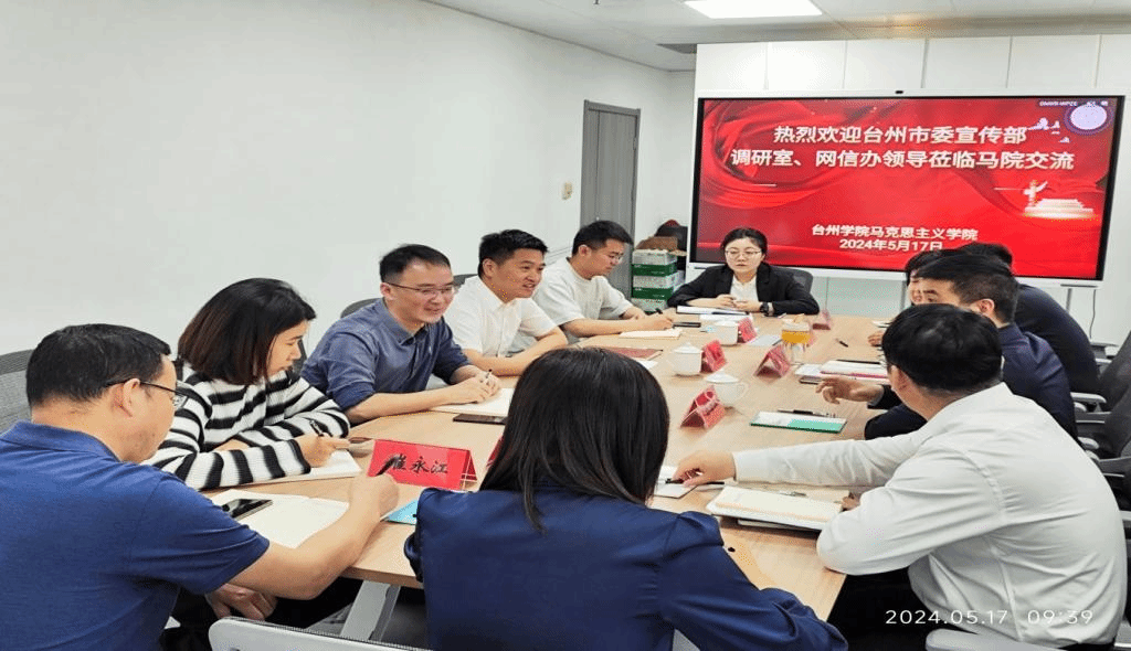 5月17日上午,台州市委宣传部调研室主任陈峰,市委网信办网络舆情导控中心主任项剑斌、副主任项益串等一行四人来校调研交流大中小学思想政治教育一体化建设工作。校党委委员、宣传部部长蔡海江陪同,一体化研究中心首席专家、马克思主义学院院长张天华教授及一体化研究中心部分成员参加交流。
