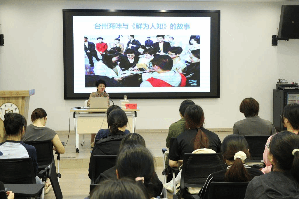 叶青老师从自己个人经历开始分享其文学创作之路,无论是在担任高中语文教师还是后来转行于行政工作,她都一直坚持用文字记录生活感悟。“随岁月尝尽人间风味”“旅行不仅在于诗和远方,更在于人间烟火”,无不体现叶老师对生活对美食饱满热情的人生体验。接着,叶老师从历史文化角度分享台州多元、绚丽的饮食文化形成,让我们看见“美食家的理想与追求”,也看见“不可低估的民间智慧”。随后,叶老师重点分享了她个人首部作品《鲜为人知》一书出版前后的故事。书中收录了53种台州传统美食,也包括许多即将消失或已经很少见到的美食。通过文字传递这些珍贵的风土人情记忆,带给我们对于台州美食和文化的认知。