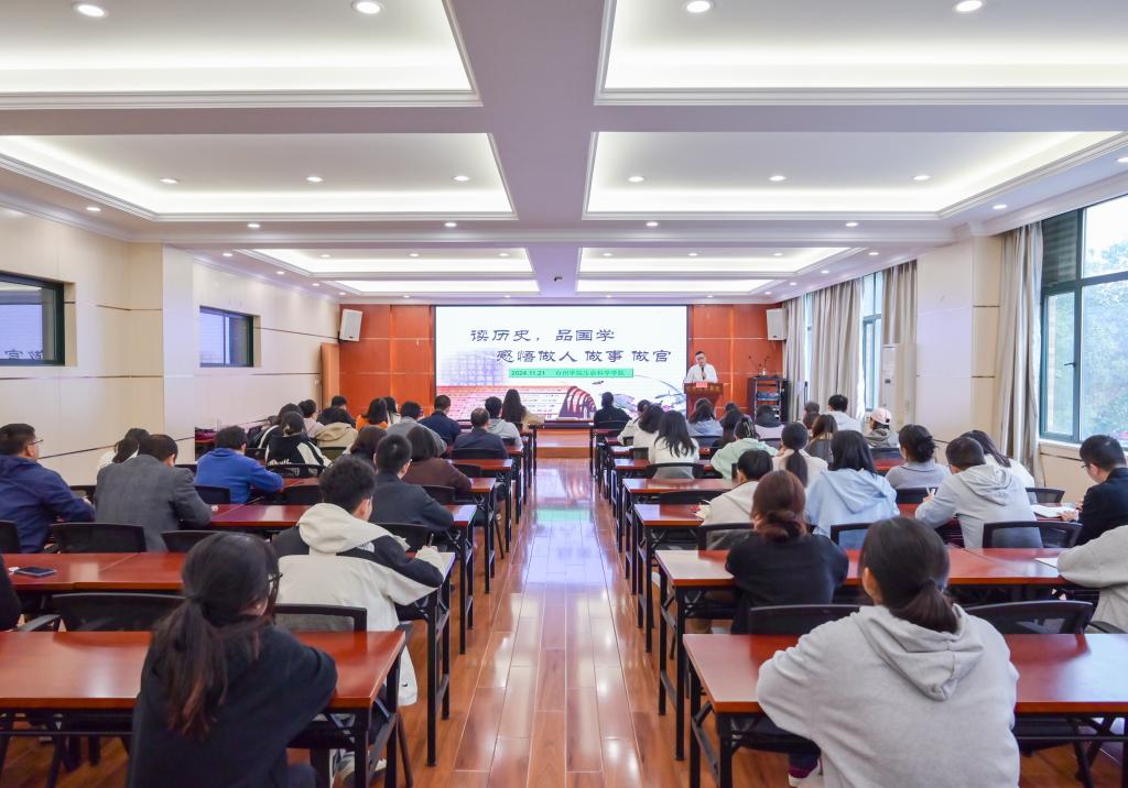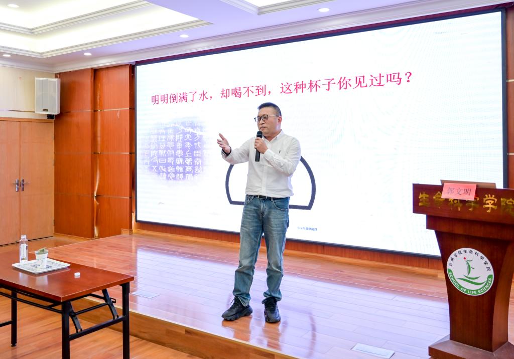 郭文明以“一个杯子引起的思考”导入,讲述孔子观器论道的典故,引出“做人不可贪,万事皆有度”的为人处世分寸;他从“人”字的一撇一捺缓缓道来,引经据典,以其深厚的理论功底和鲜活的真实案例,深入浅出地阐述了党员干部做人做事要把握好“政治上有高度,思想上有深度,能力上有强度,知识上有广度,心理上有气度”这五个“度”。授课案例丰富、贴切实际、别样生动,既是一堂对党员干部的警示教育专题党课,也是一堂对师生党员的明德修身思政教育课,令广大师生深受启发,受益匪浅。