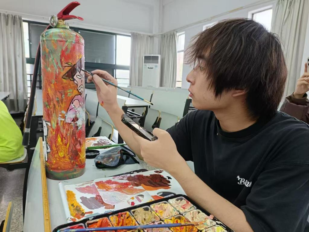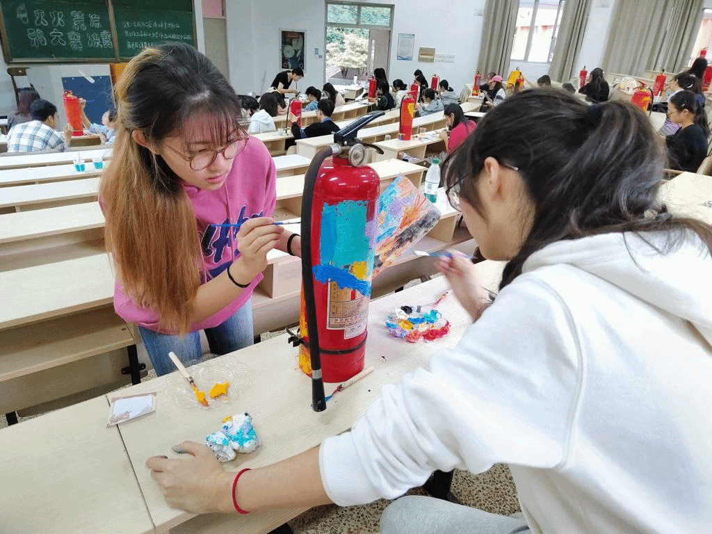 本次灭火器涂鸦大赛以消防安全为主题,要求参赛者用手中的画笔在废弃的灭火器上描绘了绚丽的图案。活动现场气氛热烈,参赛者们围绕灭火器展开创意构思,用画笔将单调的灭火器变成了独特的艺术作品。有的选手以细腻笔触勾勒出消防员逆火而行的英勇背影,生动展现了消防工作的神圣与伟大;有的选手则运用大胆的色彩与夸张的图案,向同学们直观传递火灾的危害与预防火灾的重要性;更有别出心裁者,巧妙地把灭火器与生活场景相结合,提醒大家消防安全就在身边,与每个人的校园日常息息相关。