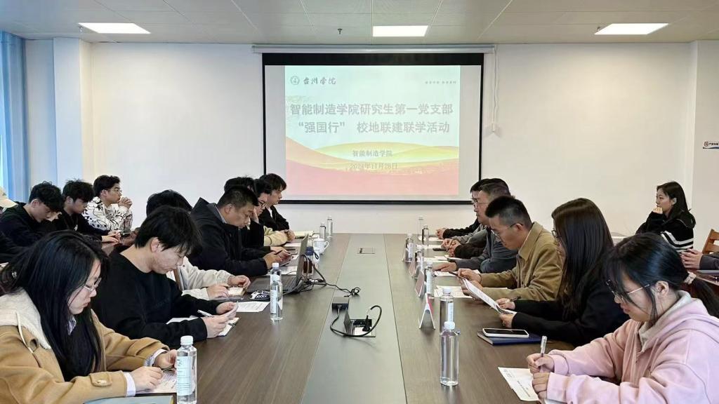 11月28日下午,椒江区社发集团党委书记、董事长雷加强一行赴台州学院智能制造学院研究生第一党支部开展“强国行”校地联建联学主题党日活动。智能制造学院院长、党委副书记陈鹏展,学院党委委员、副院长林树森出席联建联学会,学院教师第一党支部书记张勇超、研究生第一党支部全体师生党员参加学习。联建联学会由学院研究生第一党支部书记魏霞主持。