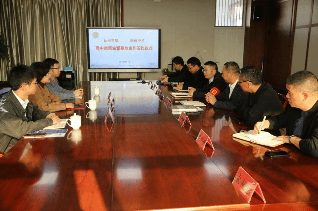 为进一步做好台州学院优质生源基地建设,12月4日上午,医药化工学院党委书记徐元红、副院长马达等一行前往台州市新桥中学签订“优质生源基地”共建协议书。台州市新桥中学党支部书记兼校长吴恩光、副书记李国华、副校长罗新峰、副校长管康元、工会主席肖烈雄、校办主任章军斌等领导班子成员热情接待。