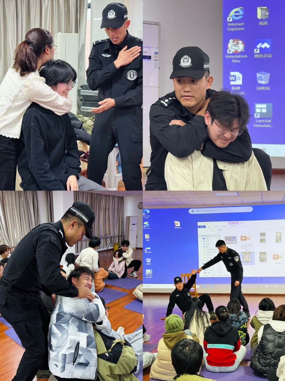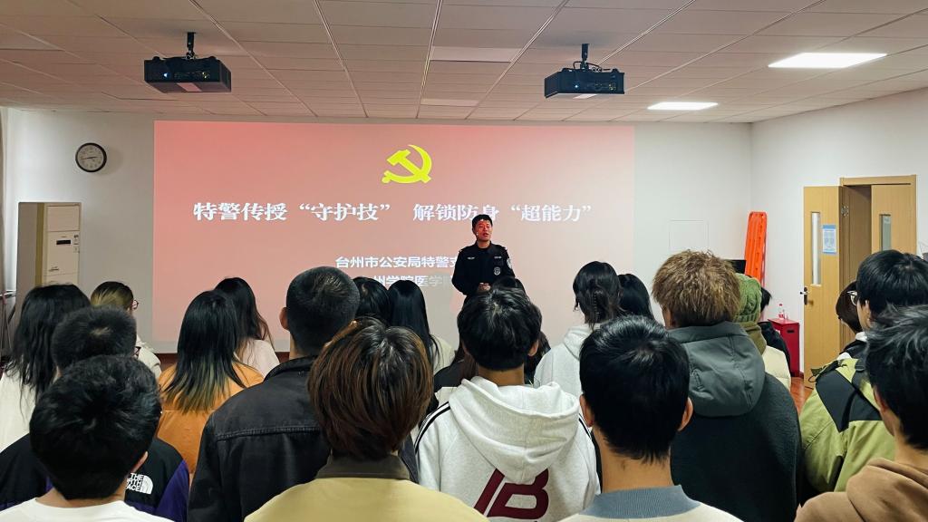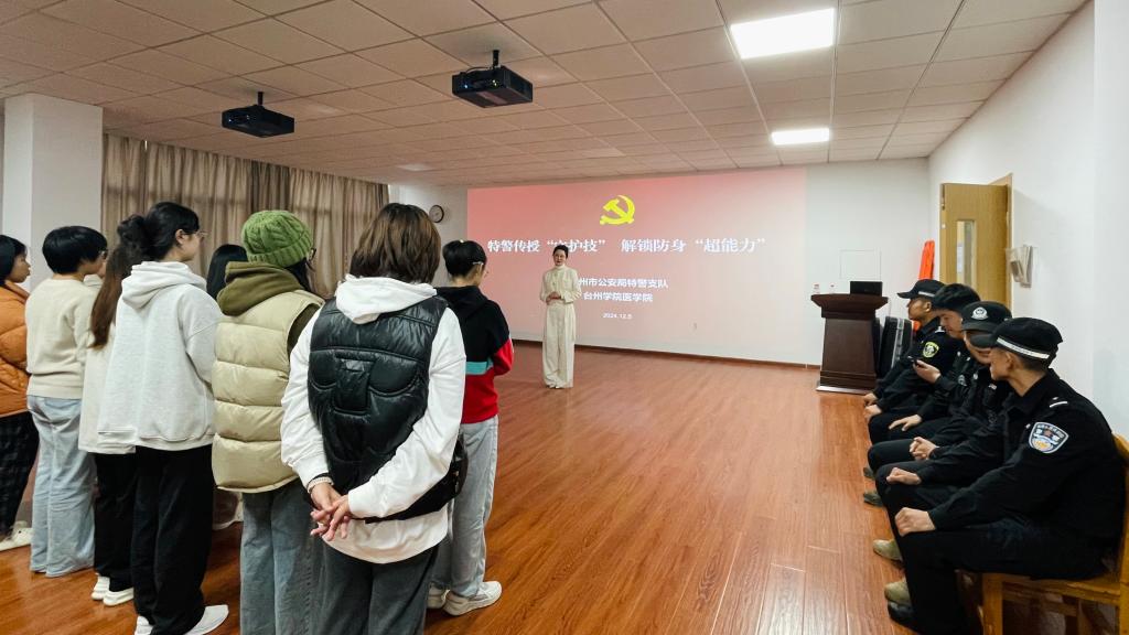 为了提升大学生的安全防范和校园突发事件应急处理能力,12月5日,医学院党委邀请党建联建单位台州市公安局特警支队为师生传授安全防护技能。特警支队综合大队大队长陈鹏亘,一大队副大队长、世界警察运动会巴西柔术项目双项冠军杨乐,国家拳击、散打一级运动员、省运会拳击冠军徐志博,国家级拳击运动健将赖茂林进校园现场授课,医学院师生代表参加。