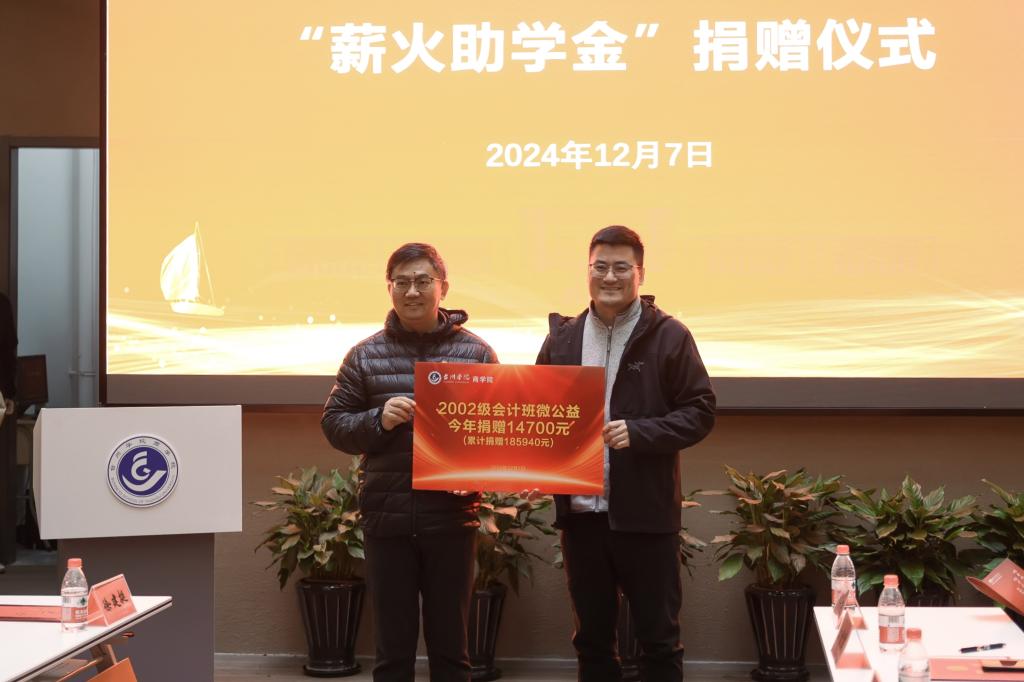 在2002级会计班微公益“薪火助学金”捐赠仪式中,副院长陈国栋向2002级会计班代表陈海云颁发捐赠证书,对校友多年来的关心关爱表示衷心的感谢,这份助学金承载着校友们多年来对学弟学妹们的深情厚谊,如同星星之火,点燃希望之光,让受助学生能在求学的道路上更坚定地追逐梦想,勇攀高峰。