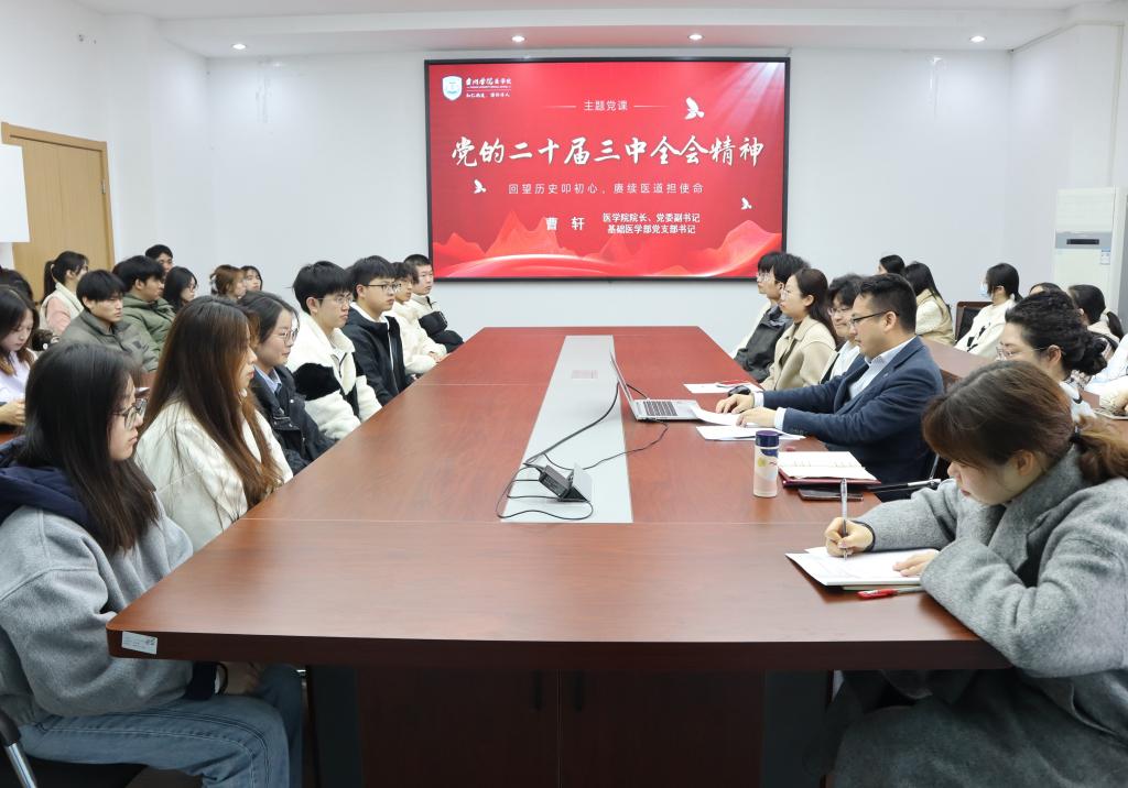 为鼓励医学生牢记时代使命,做好表率,继续发扬积极上进的学风,12月10日下午,医学院院长曹轩以“回望历史叩初心,赓续医道担使命”为主题,讲授“党的二十届三中全会精神”主题党课。医学院党委副书记周敏,全体辅导员,社会奖学金获得者代表及主要学生干部参加学习。
